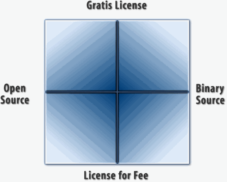 Notice that the opposite of Gratis License is License for Fee and Open Source is orthogonal to each of these terms. The opposite of Open Source is Binary Source.